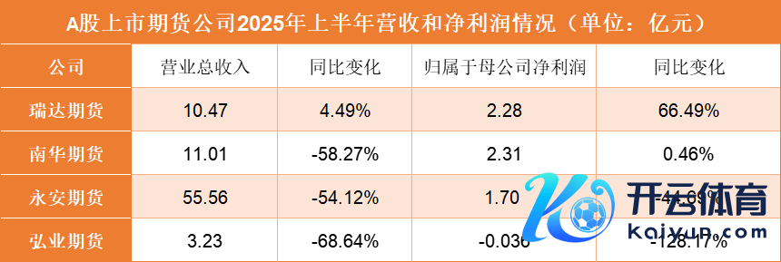 据界面新闻统计,上半年,南华期货、永安期货(600927.SZ)、瑞达期货(002961.SZ)和弘业期货四家公司累计营收80.27亿元,累计净利润6.25亿元。