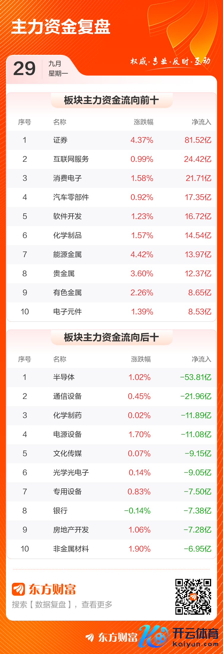9月29日,沪指涨0.9%,深成指涨2.05%,创业板指涨2.74%。两市成交额2.16万亿,较上个往改日放量146亿。数据泄露,本日大盘主力资金净流入18.06亿。证券、互联网就业、消耗电子等板块主力资金流入排行居前,其中证券净流入81.52亿元。