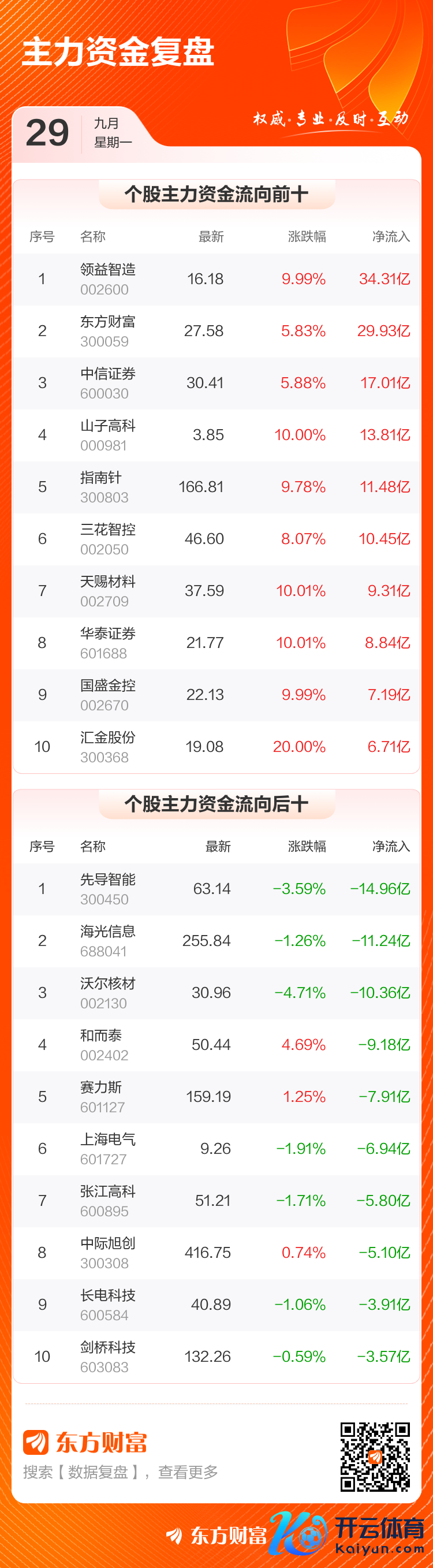 主力净买入个股中,领益智造排行第一,主力净买入34.31亿元,该股本日涨停;东方资产排行第二,主力净买入29.93亿元。